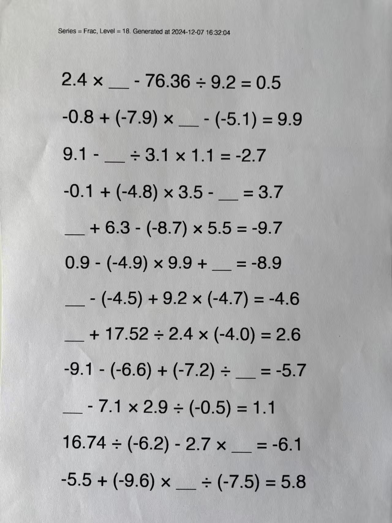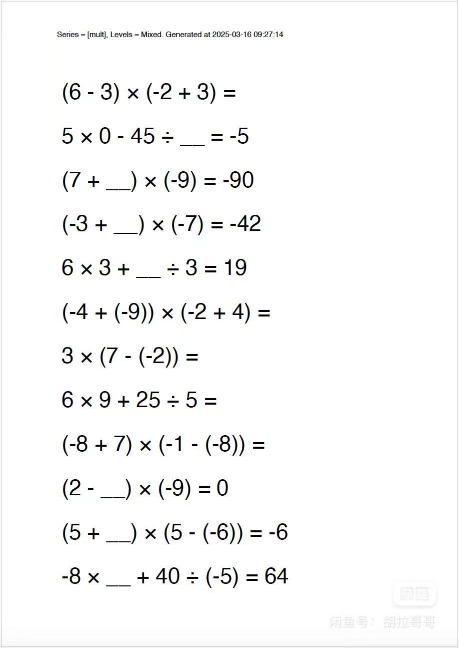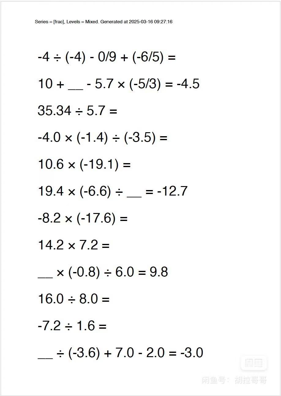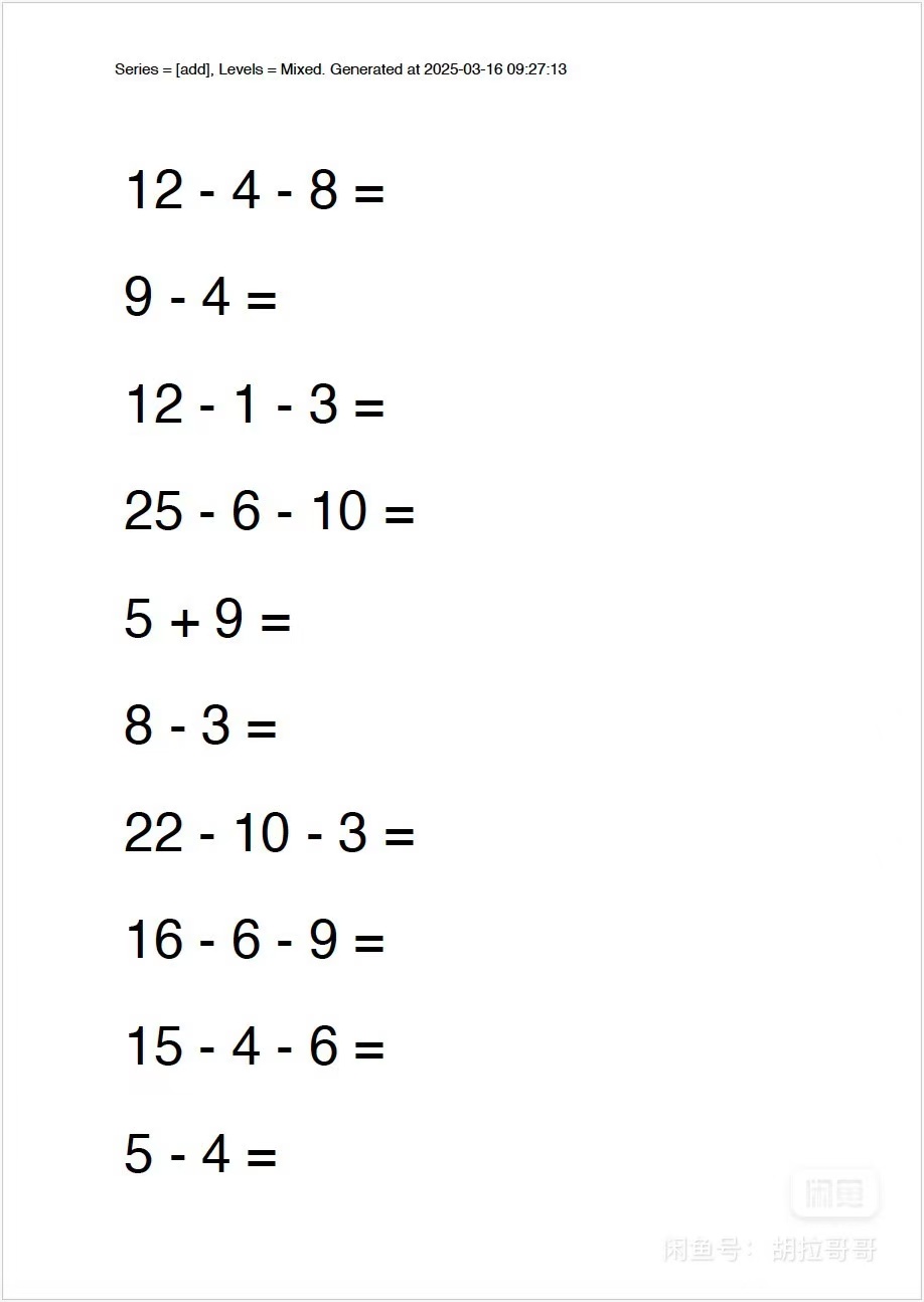 - 目前有三个系列的练习题:加减法、乘除法,以及分数小数。